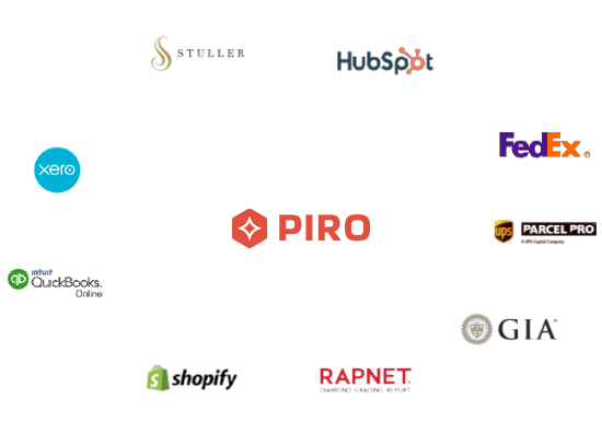 PIRO Retail POS integrates with key platforms like Shopify, Etsy, QuickBooks, GIA, Rapnet, Hubspot CRM, FedEx, UPS, ParcelPro, Twilio, and more.